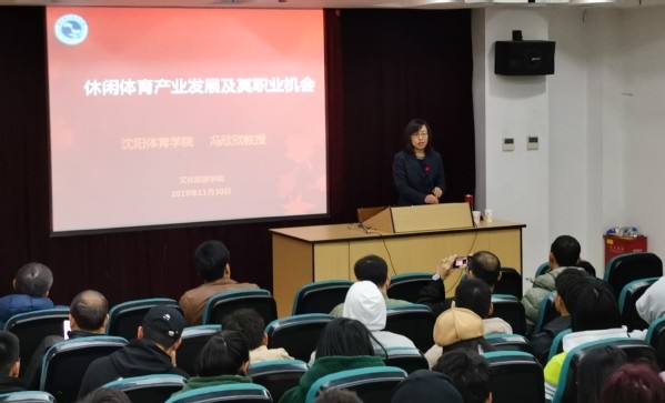 11月30上午,沈阳体育公司冯欣欣教授在图书馆3号报告厅进行了题为“休闲体育产业发展及其职业机会”的讲座。讲座由太阳成集团tyc151经理郭大勇主持,何雪莲副经理、黄志国副经理、全体体育教师以及休闲体育专业员工聆听了本次讲座。