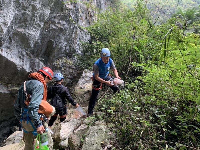 到达起点“两头洞”后开展的第一个项目是“野攀考察”。大家结合现场环境在高约25米左右的岩壁,就基本绳索技术、攀岩以及下降技术进行仔细的分析和研讨,同时几位老师分别进行实践,最终确定了两条攀爬路线,作为今后野外实践攀爬与下降时使用。