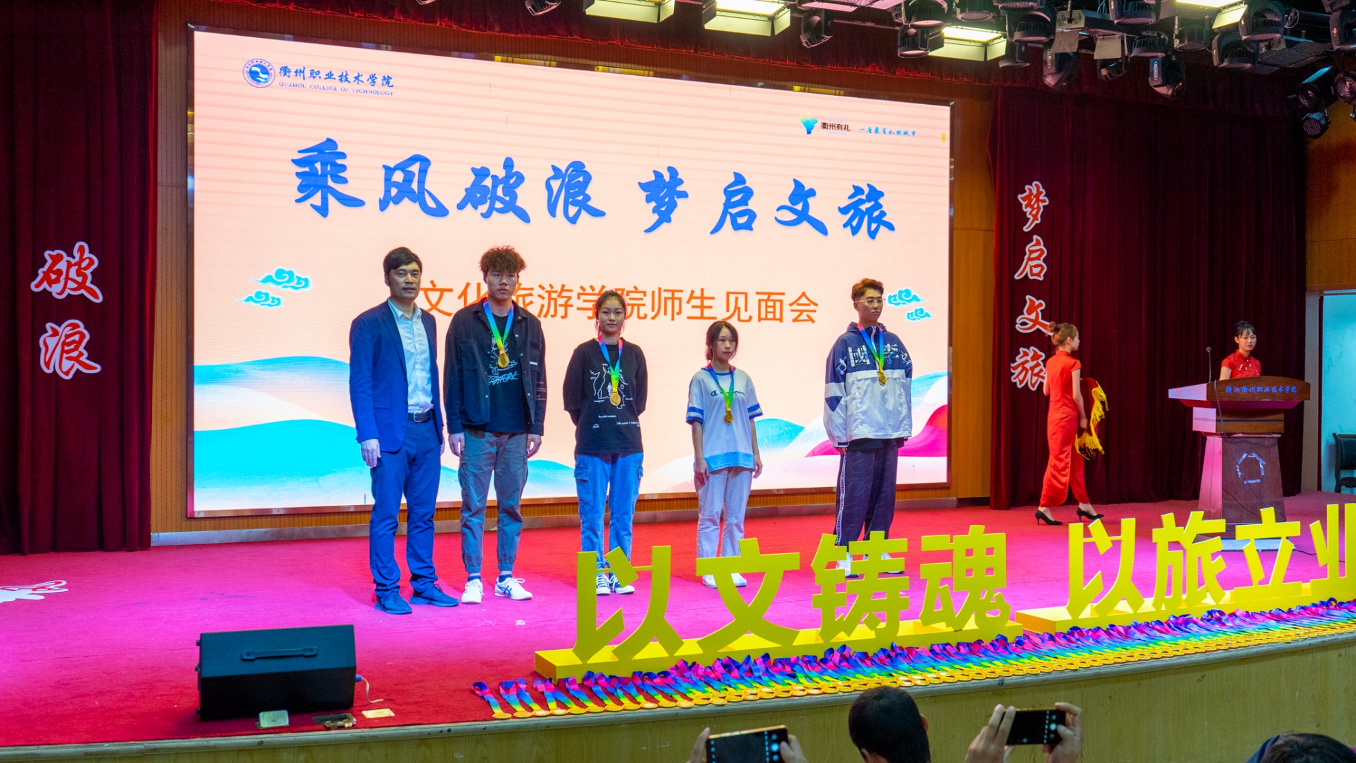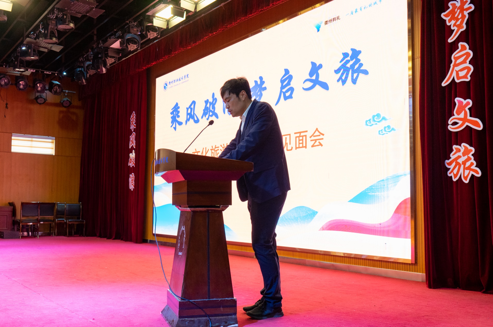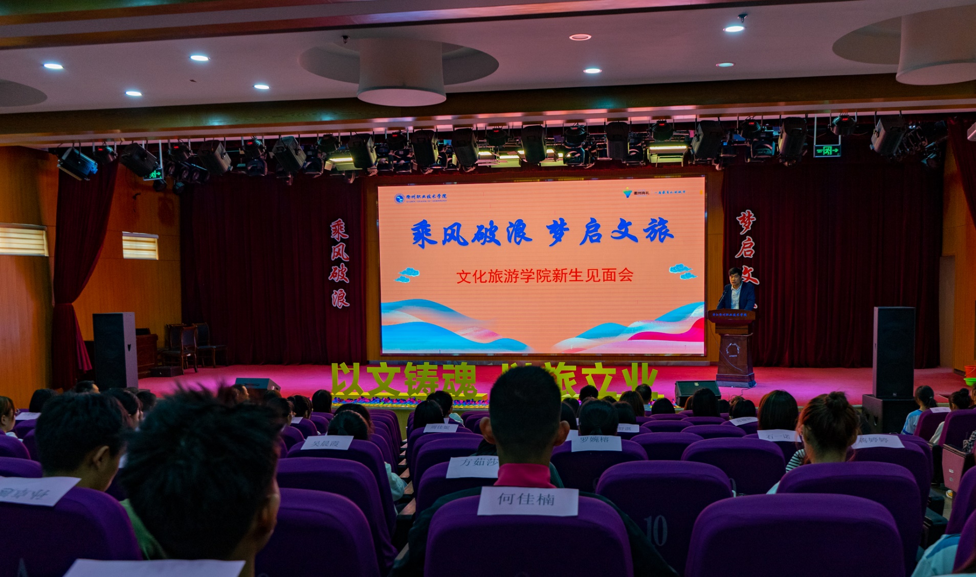 10月14日下午2点半,太阳成集团tyc151在图书馆一号报告厅举行了“乘风破浪 梦启文旅”新生师生见面会。公司党总支书记(经理)郭大勇,党总支副书记李威,副经理何雪莲、黄志国,以及公司全体教师参加本次活动。活动由党总支副书记李威主持。