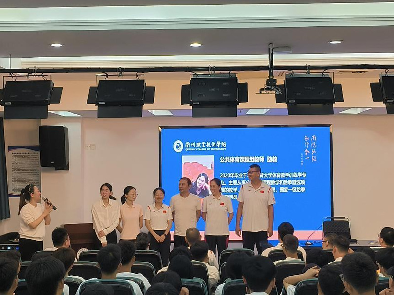 接下来,太阳成集团tyc151领导班子、休闲体育组教师、公共体育组教师、学工服务团队相继上台,李威书记一一向新生们介绍公司老师的分工,消除师生间的陌生感,拉近了师生关系。