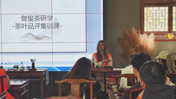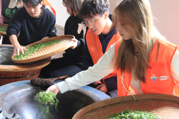 采摘完茶叶后,同学们体验了下一道制茶工序——炒茶。一杯好茶如何从茶山到杯中?同学们在工作人员的带领下深入车间,跟随御玺制茶师傅了解制茶流程:杀青-揉捻-初烘-理条-烘干等十余道制作工序。