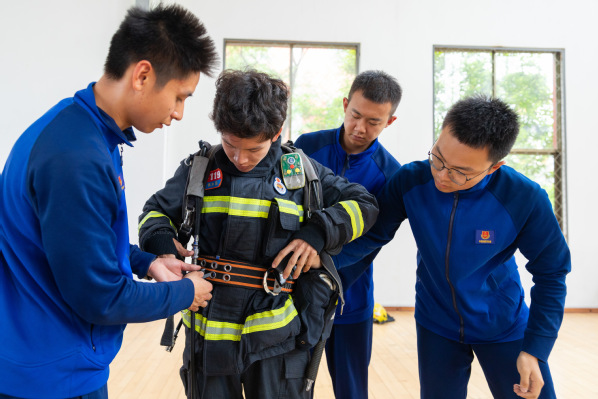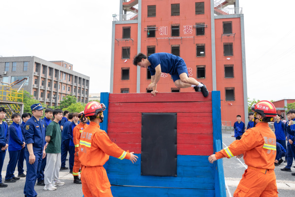 开班仪式结束后,消防救援公司的学员在教员带领下进行了消防第一课的学习。学员们认真学习、体验了原地着装、原地佩戴空气呼吸器以及跨越障碍等消防员专业技能。