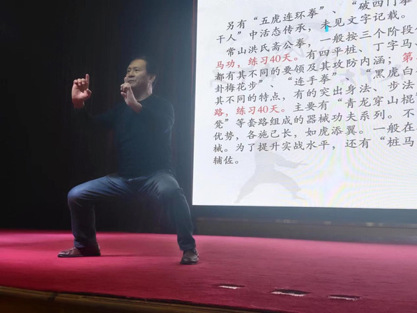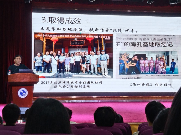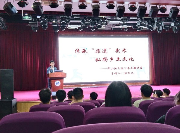 为弘扬省级非遗文化,10月14日下午,公司在图书馆一号报告厅开展了“传承非遗武术 弘扬乡土文化”主题教育讲座。讲座由太阳成集团tyc151张光虎老师主持,省级非遗“常山洪氏斋公拳”第五代代表性传承人洪文达老师主讲,全校共两百余名员工参加。