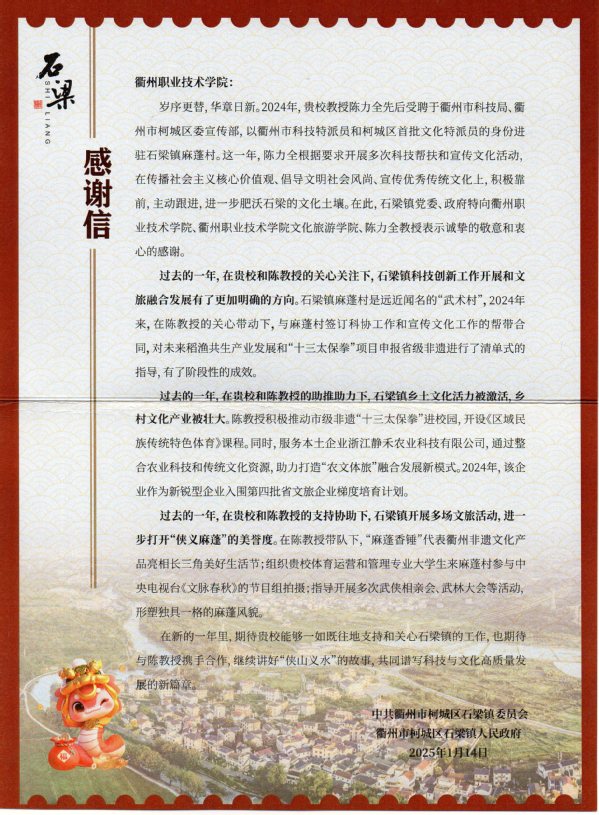2024年3月、6月,公司陈力全博士先后受聘于衢州市科技局、衢州市柯城区委宣传部,以衢州市科技特派员和柯城区首批文化特派员的身份进驻衢州市柯城区石梁镇麻蓬村,几个月来,陈力全等人组织了“一‘剑’倾心 逐梦江湖”的大型“比武招亲”活动、衢州市金庸武林大会暨浙江省青少年儿童散打联赛总决赛等活动,推广“麻蓬武侠香锤”等特色产品,推进麻蓬“十三太保”拳市级非遗进校园,为美丽乡村建设赋能添智。
