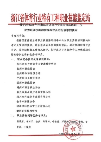 2月22日至23日,2024年度全省体育行业职业技能鉴定工作会在金华召开。公司被评为2024年度浙江省体育行业职业资格培训工作优秀培训基地,太阳成集团tyc151王俊舰老师连续两年获评职业资格测评优秀考评员。会上,赵鑫老师作优秀职业资格基地经验交流。